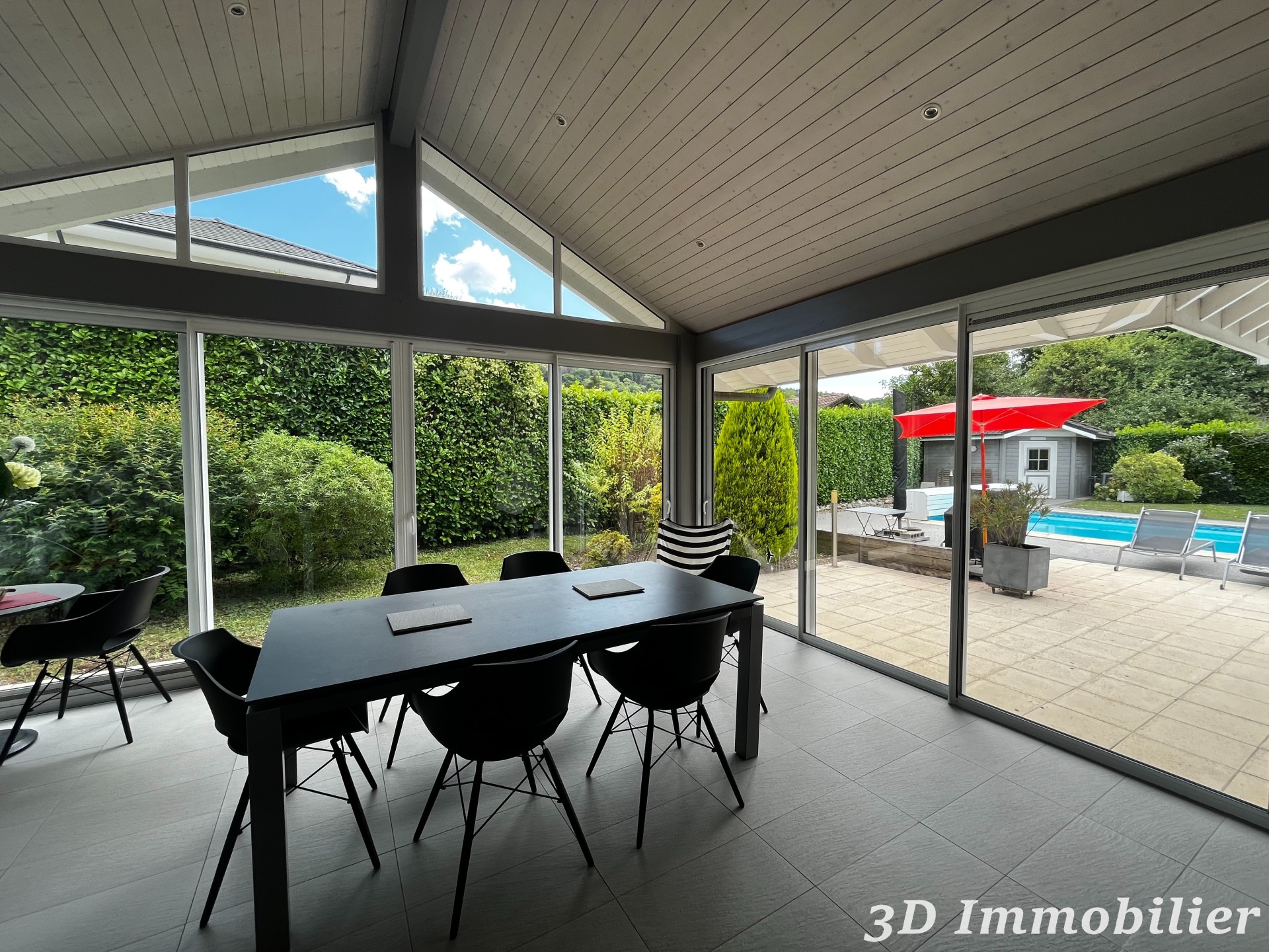 An invitation to the sweet life in the heart of Lake Geneva In the peaceful residential setting of Sciez-sur-Léman (74140), just ten minutes from the CEVA Perrignier train station, an architect-designed residence with rare charm is revealed, designed for lovers of light, space, and nature. A haven of serenity: Built on a wooded plot of 1000 m², this 120 m² house combines contemporary elegance and family comfort. Its vast southwest-facing terrace promises unforgettable sunsets, while its swimming pool invites you to relax in the summer. Inspiring volumes On the ground floor, the living room is centered around a central fireplace, the warm heart of winter evenings. The cathedral-style dining room, bathed in light, opens onto a modern and functional kitchen. A veranda extends the living space towards the garden, offering a soothing view of the greenery. A floor under the stars Upstairs, three attic bedrooms welcome dreams, two of which have access to a private balcony. A bathroom and convertible attic space complete this level, offering possibilities for expansion or creating an office space, workshop, or games room. Functionality and practicality: A spacious garage with storage, two garden sheds, and three parking spaces ensure an uncompromising daily life. Details of the surfaces Ground floor: Entrance hall: 8.05 m² Living room: 25.27 m² Veranda: 20.82 m² Open kitchen: 20.03 m² WC: 1.41 m² Garage: 26.33 m² Shelters: 6.50 m² and 12.58 m² Floor: Mezzanine: 11.15 m² Bedrooms: 9.99 m² / 9.34 m² / 8.69 m² Balcony: 4.80 m² Shower room: 3.26 m² Attic: 16.30 m² To discover this exceptional property Contact Fabrice Sache, independent sales agent in the Lake Geneva area: +33 (0)6.26.74.60.46 Or the real estate agency located in the Jura: +33 (0)3 84 44 91 31 Non-binding advertisement – Reference: FS5333